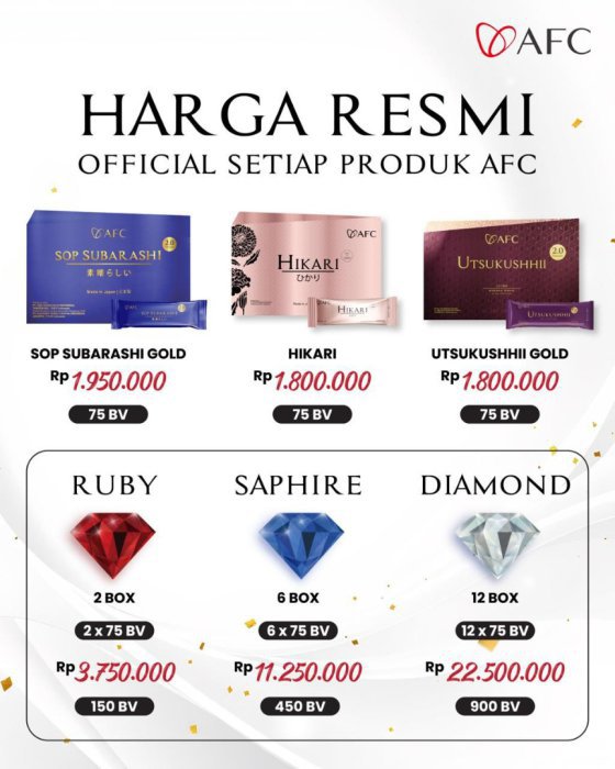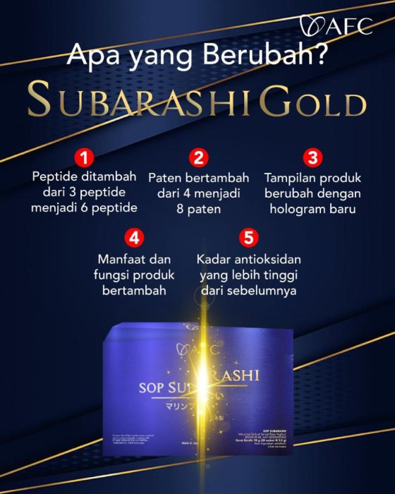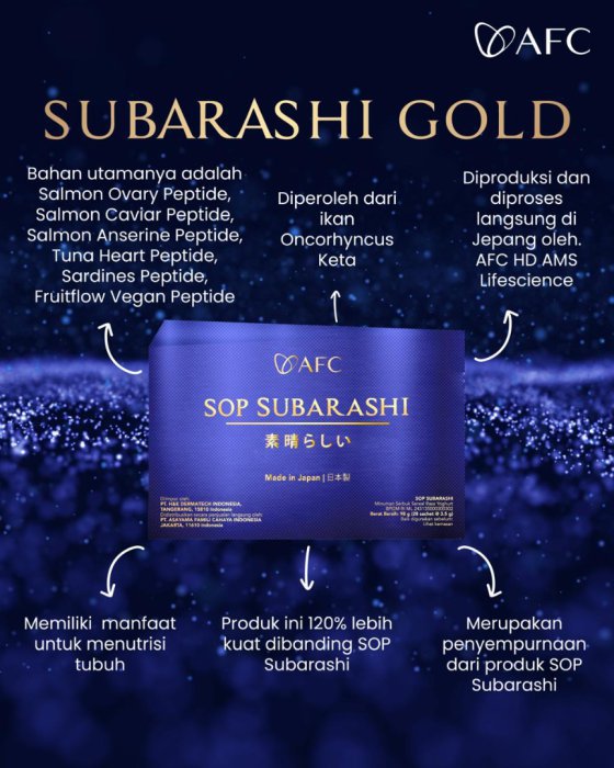 SOP SUBARASHI merupakan produk Triple Peptide PERTAMA di Jepang yang memiliki bahan utama yaitu Marine Placenta ikan Oncorhyncus Keta Salmon di Hokkaido, Sardine Peptide dan Fruitflow (Vegan peptide). Diolah dan diproses dengan teknologi terkini dari Jepang sehingga menghasilkan peptide nano size 600 Dalton, sehingga mudah untuk diserap dan berfungsi maksimal dalam tubuh manusiaBerdiri sejak tahun 1969, AFC Japan adalahPERUSAHAAN PHARMACY salah satu yang tertua dan terbesar di Jepang- Perusahaan farmasi pertama yang terdaftar di TOKYO STOCK EXCHANGE- Pabrik farmasi Jepang pertama yang mendapatkan sertifikat GMP- Perusahaan AFC yang sudah GO-PUBLIC telah hadir di Indonesia. Terdaftar di AP2LI Menjadi perusahaan Direct Selling terbesar dan terpercaya di Indonesia.PRODUKSOP SUBARASHISOP SUBARASHI merupakan produk Triple Peptide PERTAMA di Jepang yang memiliki bahan utama yaitu Marine Placenta ikan Oncorhyncus Keta Salmon di Hokkaido, Sardine Peptide dan Fruitflow (Vegan peptide). Diolah dan diproses dengan teknologi terkini dari Jepang sehingga menghasilkan peptide nano size 600 Dalton, sehingga mudah untuk diserap dan berfungsi maksimal dalam tubuh manusia. MANFAAT PRODUKYANG DIRASAKAN PARA KONSUMEN Manfaat produk yang dirasakan para konsumen:Memperbaiki sel yang sudah rusakMengaktifkan kembali sel yang tertidurMeregenerasi sel yang butuh pembaharuanMembantu mengatasi masalah yang berkaitan dengan StrokeMembantu mengatasi masalah yang berkaitan dengan JantungMembantu mengatasi masalah yang berkaitan dengan Pembuluh darahMembantu mengatasi masalah yang berkaitan dengan Tekanan darahMembantu mengatasi masalah yang berkaitan dengan GinjalMembantu mengatasi masalah yang berkaitan dengan PankreasMembantu mengatasi masalah yang berkaitan dengan AsmaMembantu mencegah pembekuan darahMembantu menurunkan tekanan darah tinggiMembantu mencegah keluarnya albumin pada pasien gagal ginjalMembantu menjaga kestabilan hormonMembantu meningkatkan jumlah dan kualitas ASIMembantu mengatasi masalah yang berkaitan dengan sendiMembantu mengatasi masalah yang berkaitan dengan kerutan (Keriput)Membantu memperbaiki toleransi tubuh pada glukosaMinat hub +62 877-8165-4080